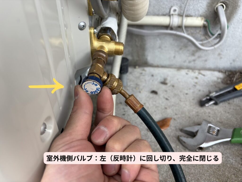 - 室外機側サービスポートのコントロールバルブのレバー: 反時計回り(左)にいっぱいまで回して、完全に閉じた状態(中の虫ピンを全く押していない状態)にしておきます。