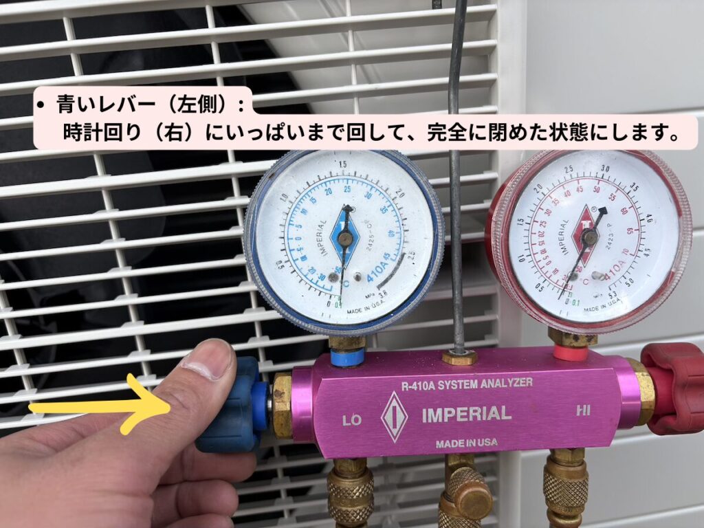 - マニホールドゲージの青いレバー(左側): 時計回り(右)にいっぱいまで回して、完全に閉めた状態にします。