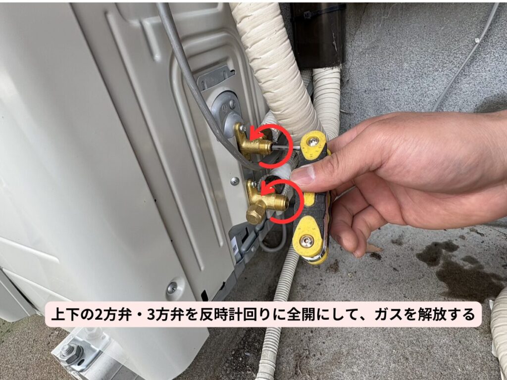 5. 室外機側の配管・電線外しと「ガス抜け」確認